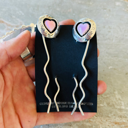 Navajo Lyanne Goodluck Sterling Silver & Pink Conch Shadowbox Heart Hair Pins