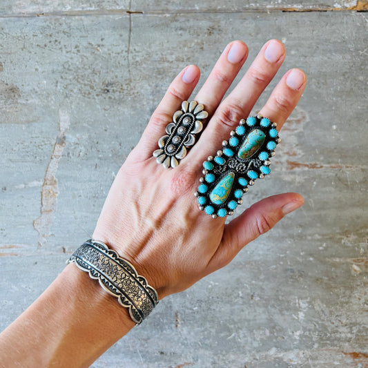 Navajo Leon Martinez Sterling Silver & Kingman Turquoise Cluster Statement Ring