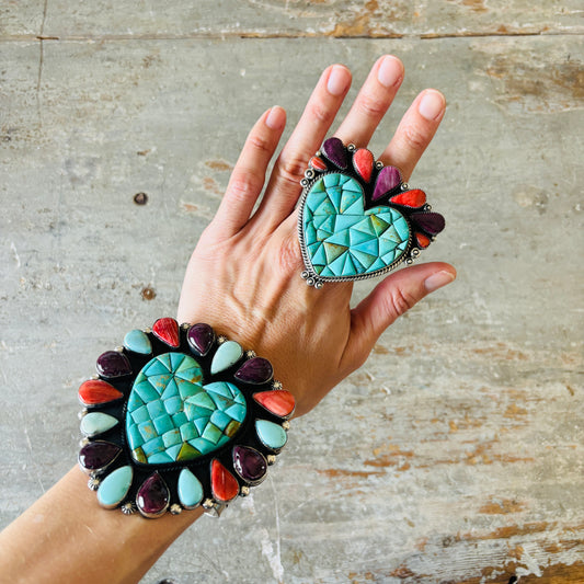 Navajo Hemerson Brown Sterling Silver - Orange - Purple Spiny & Kingman Turquoise Heart Cobblestone Ring