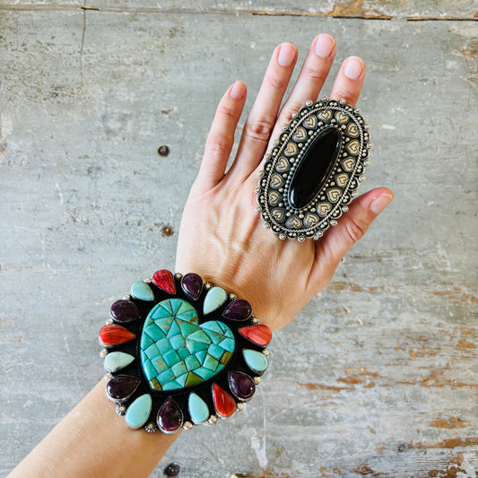 Navajo Hemerson Brown Sterling Silver & Black Onyx Hearts Statement Ring