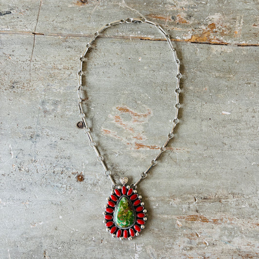 Navajo Hemerson Brown Sterling Silver - Red Coral & Sonoran Turquoise Cluster Heart Necklace