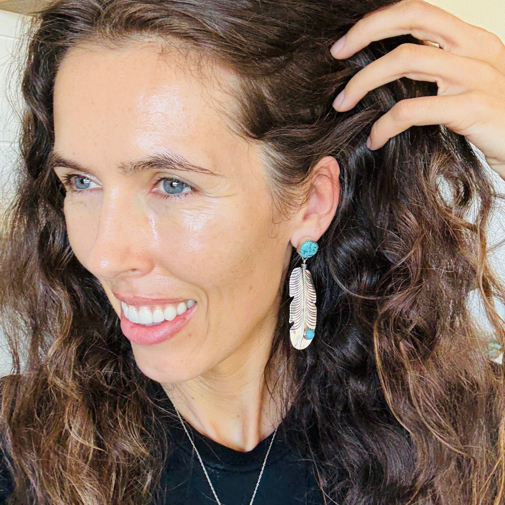 Navajo Lydia Begay Sterling Silver & Kingman Feather Earrings