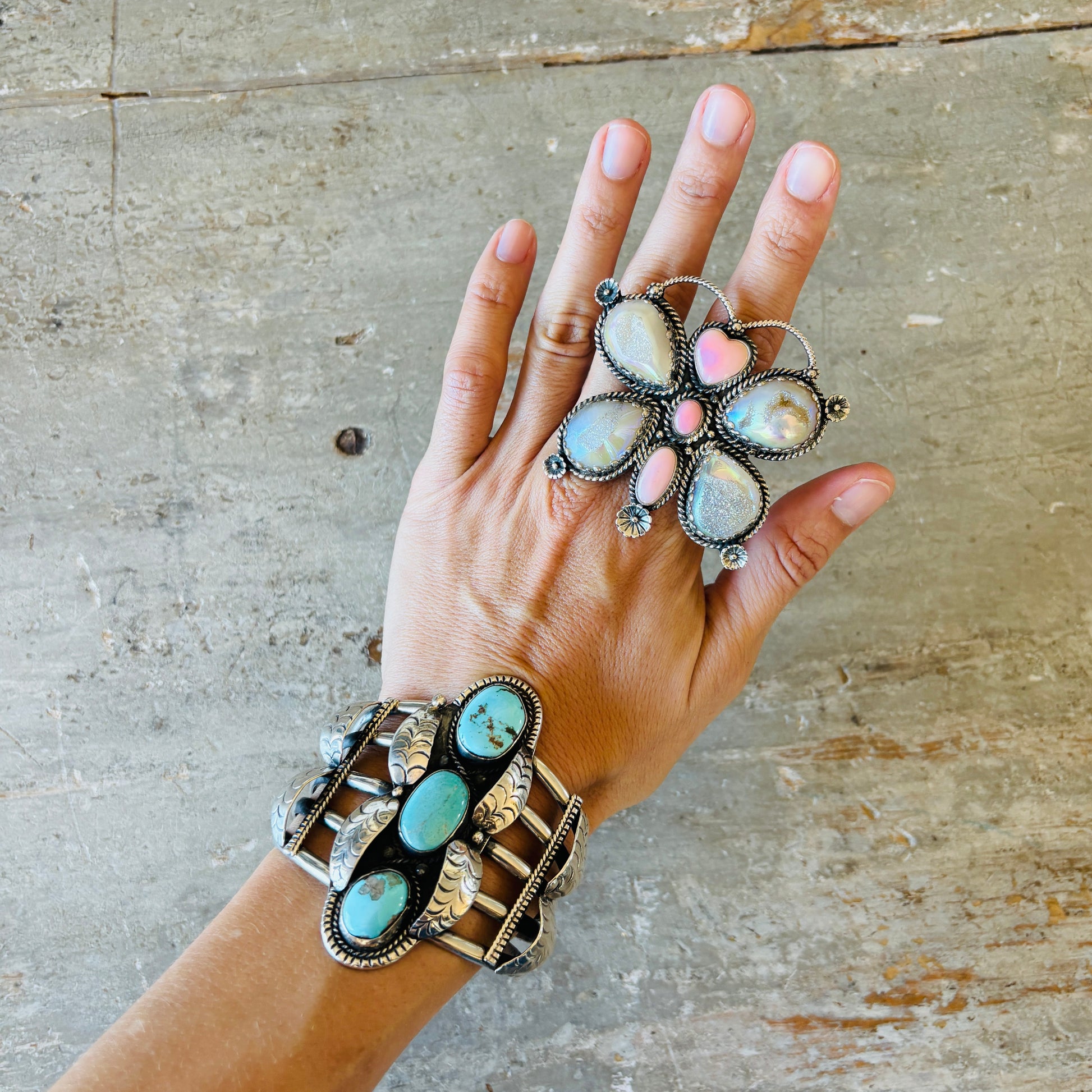Navajo Hemerson Brown Sterling Silver - Pink Conch & Druzy Butterfly Ring