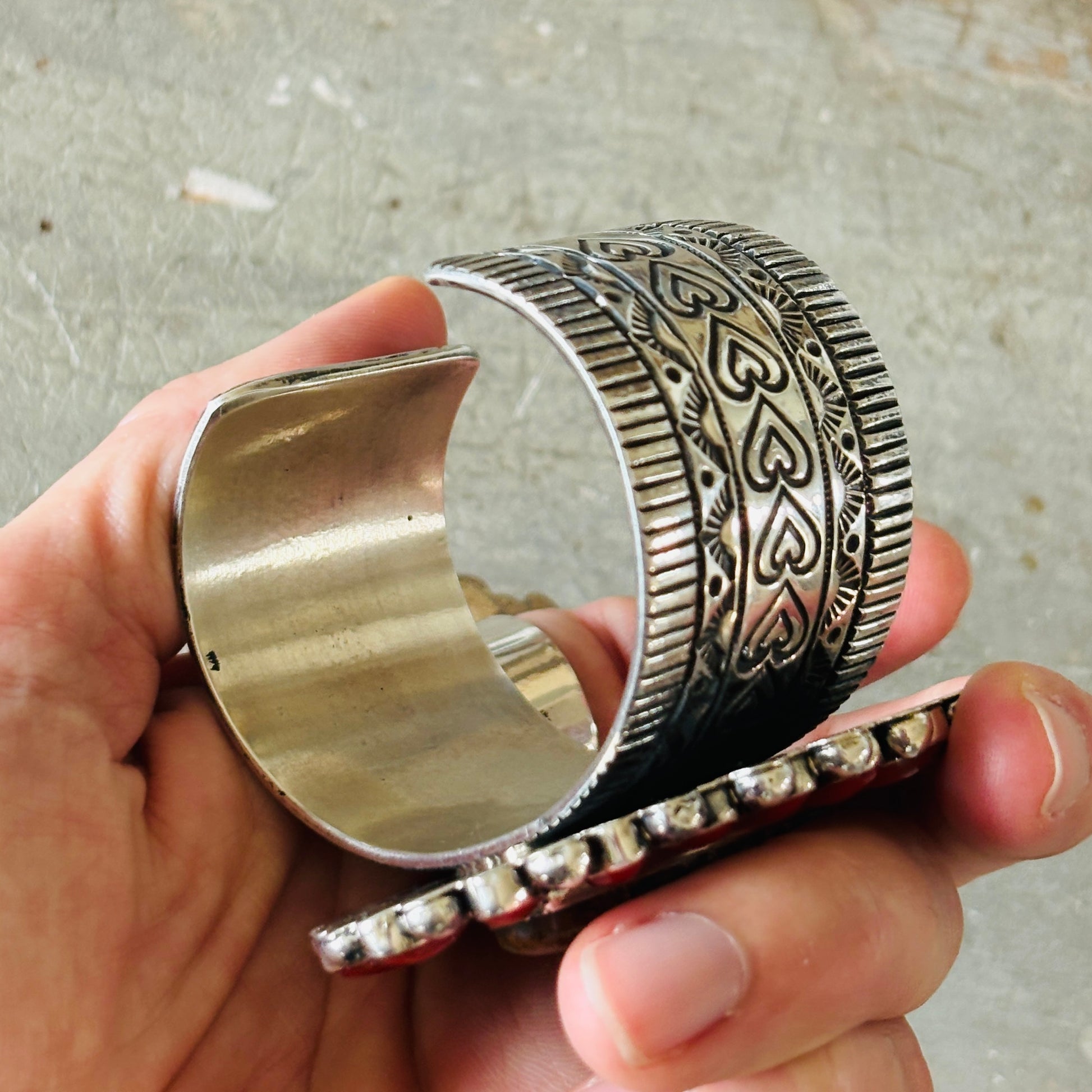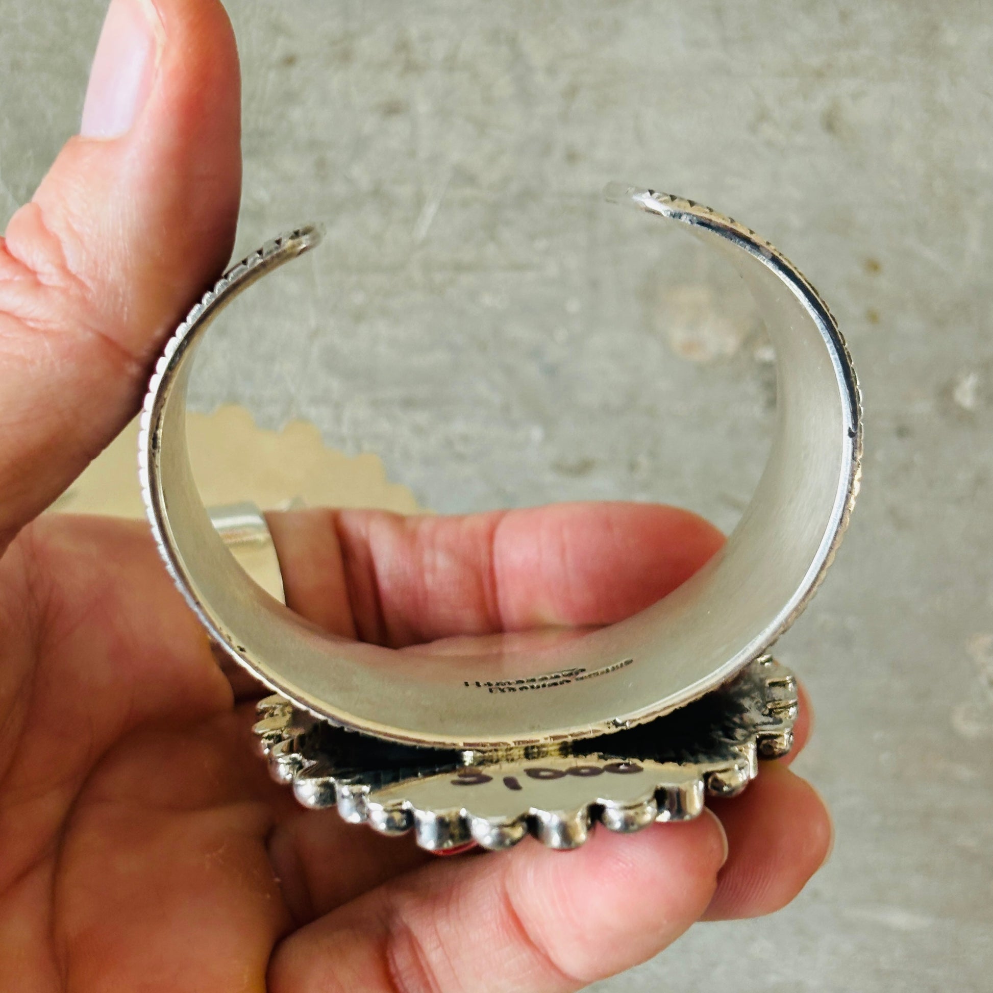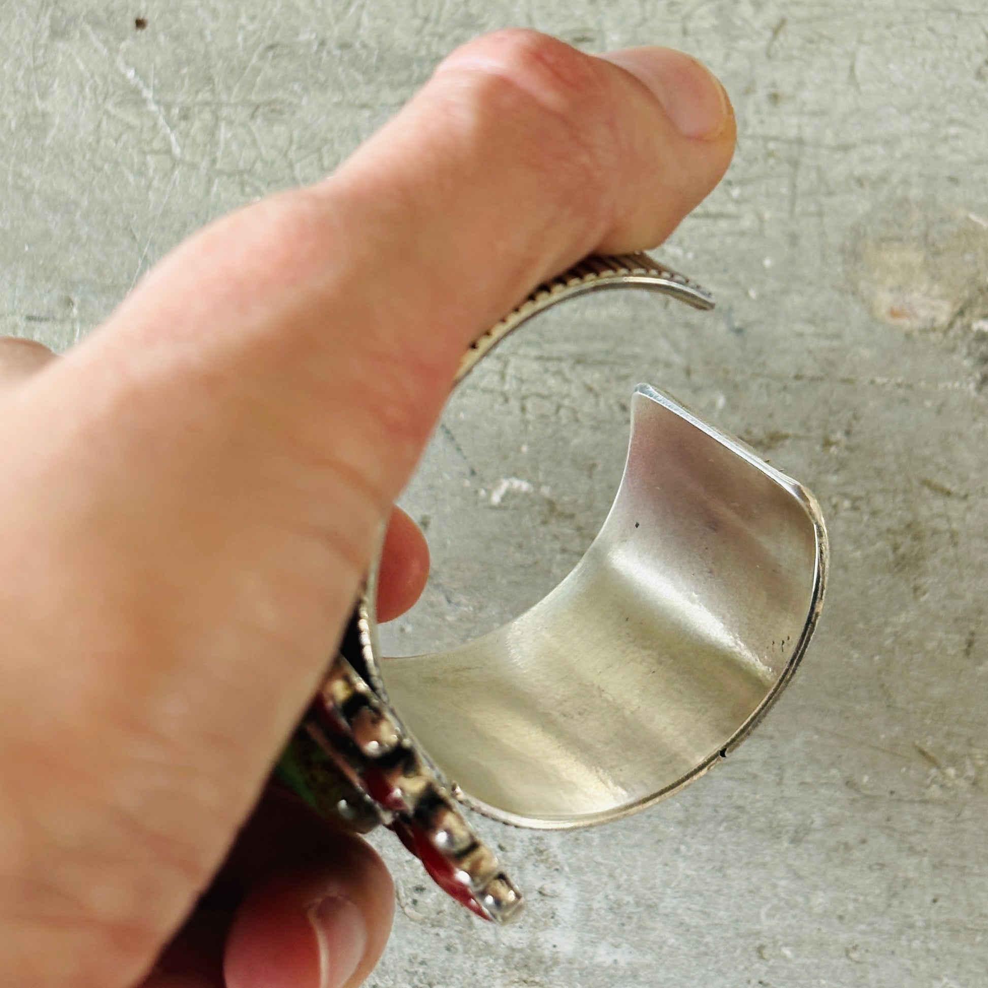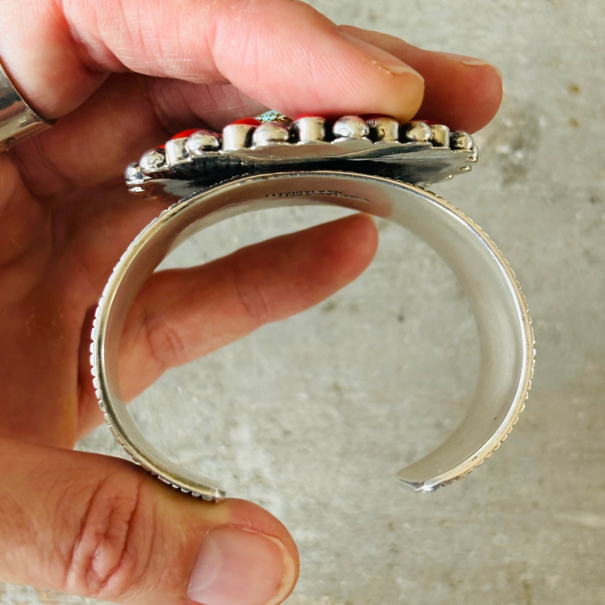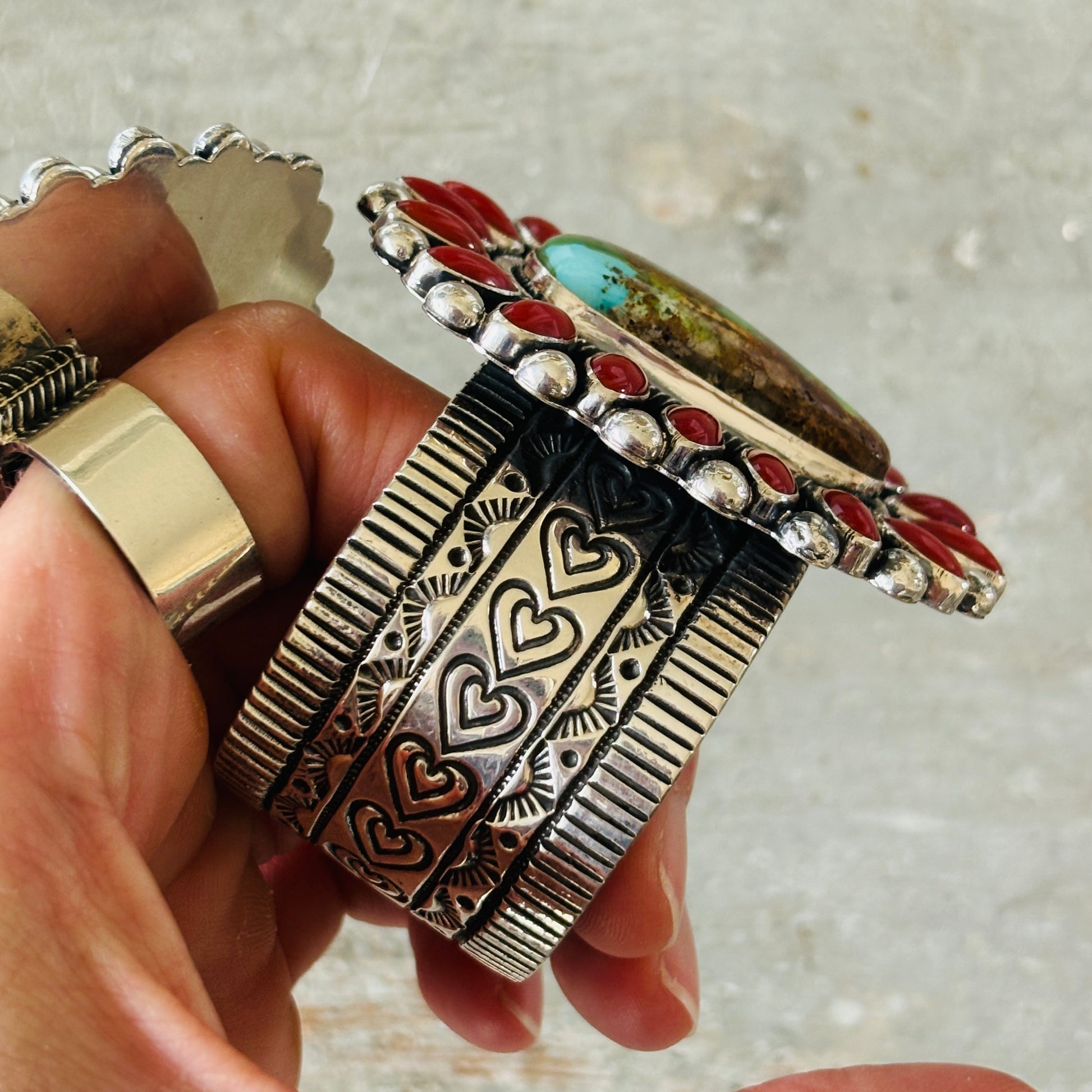 Navajo Hemerson Brown Sterling Silver - Red Coral & Sonoran Turquoise Cluster Hearts Cuff