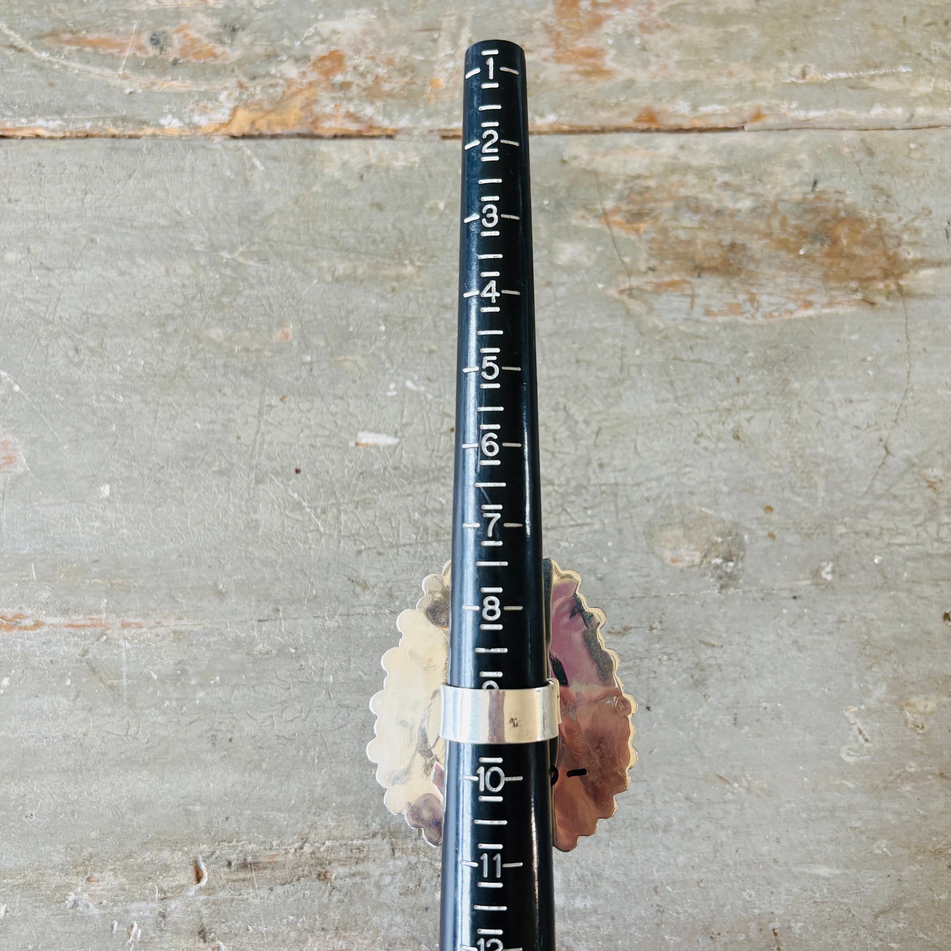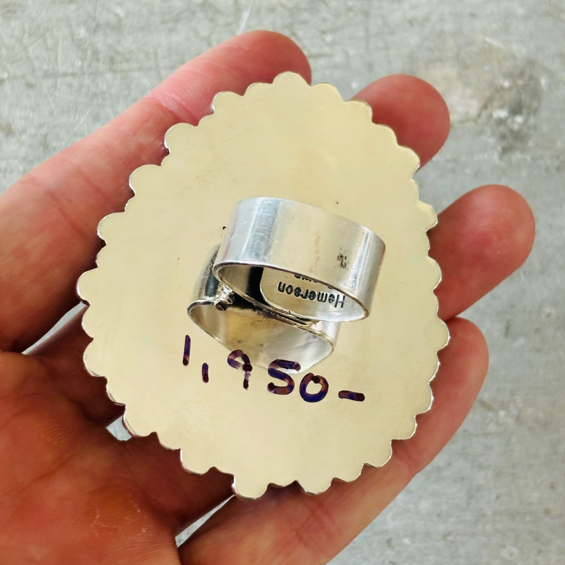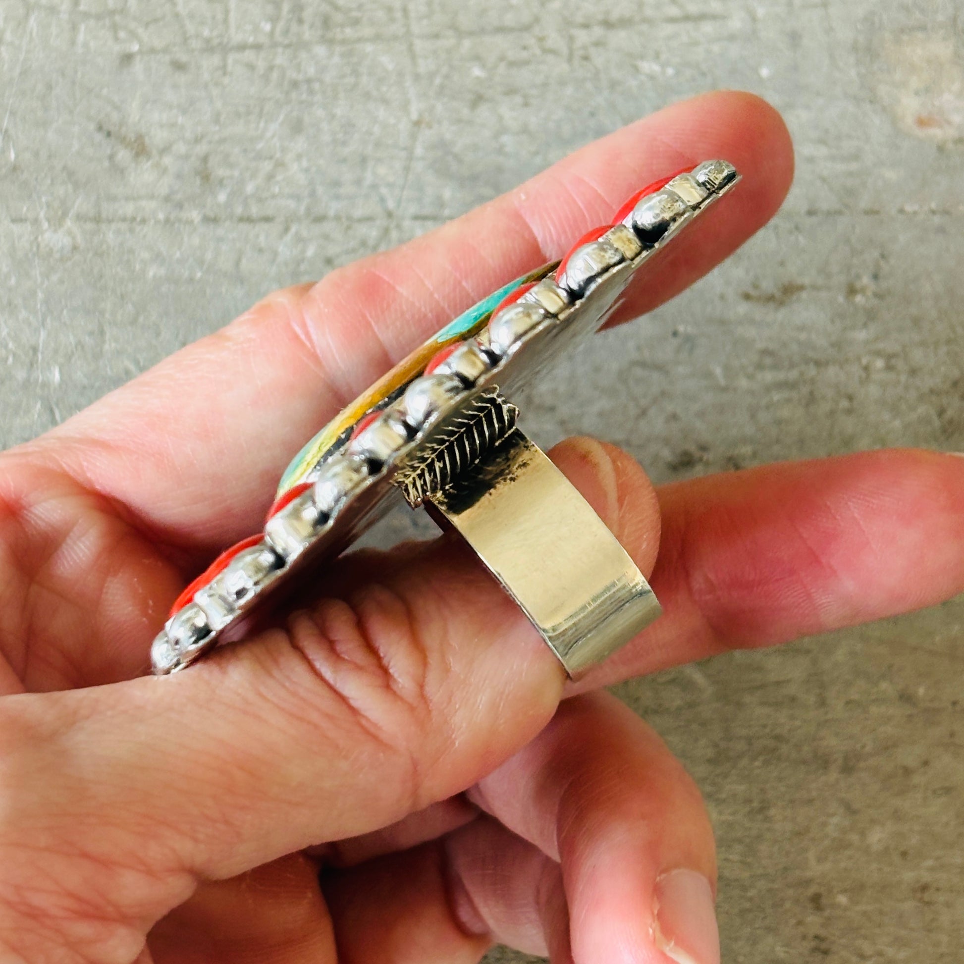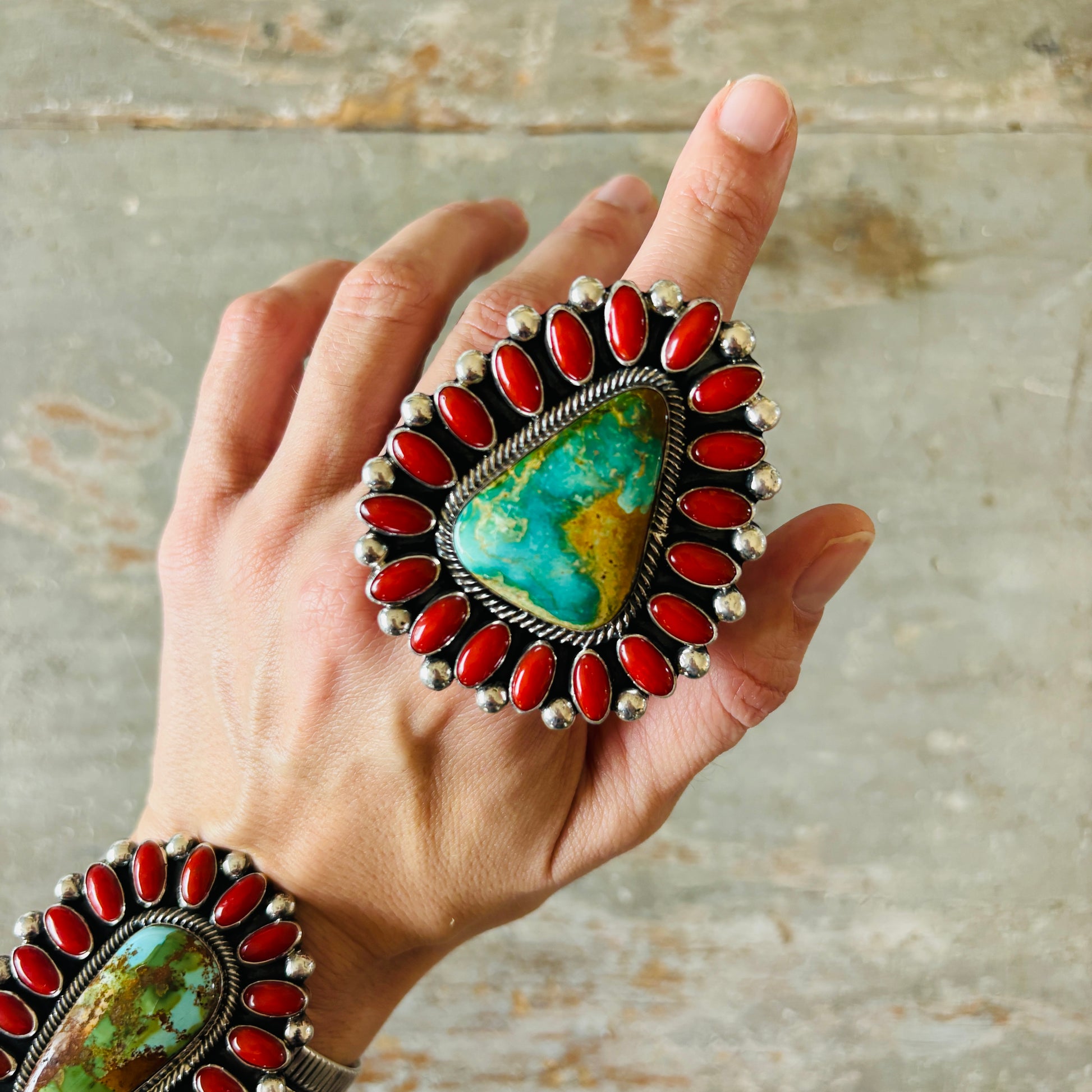 Navajo Hemerson Brown Sterling Silver - Red Coral & Sonoran Turquoise Cluster Ring