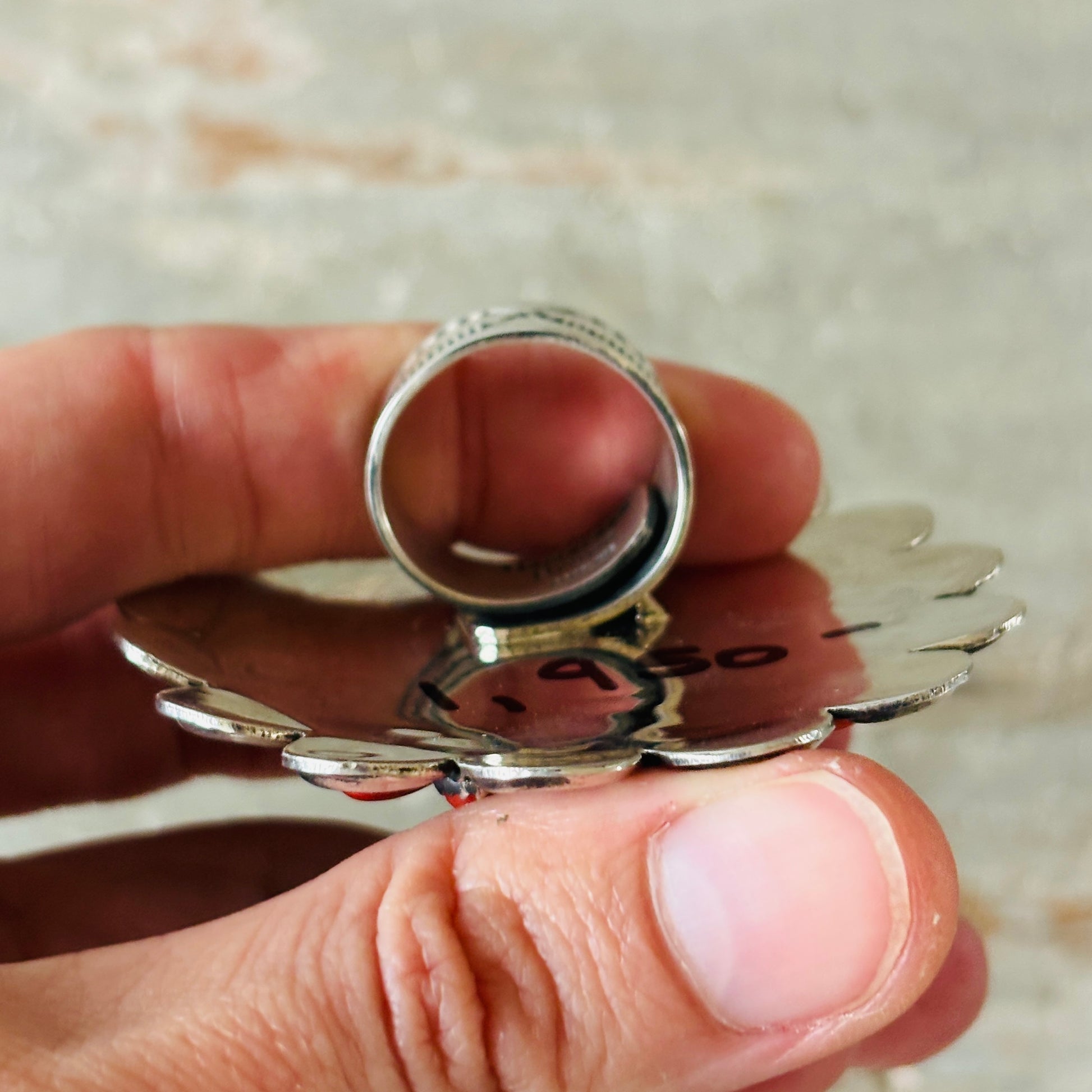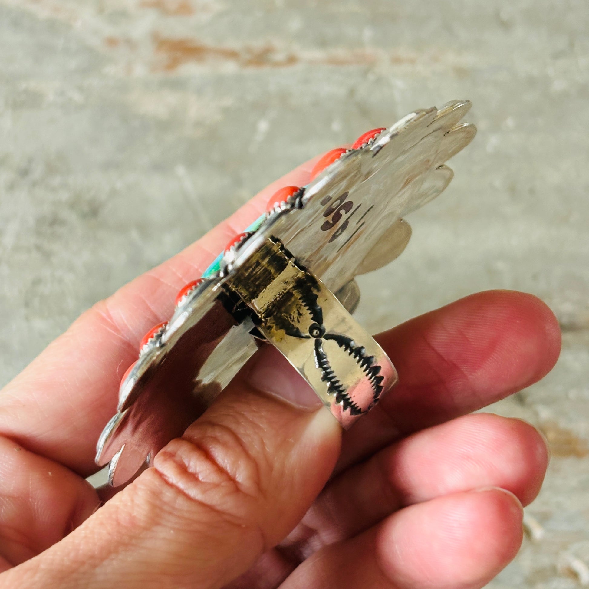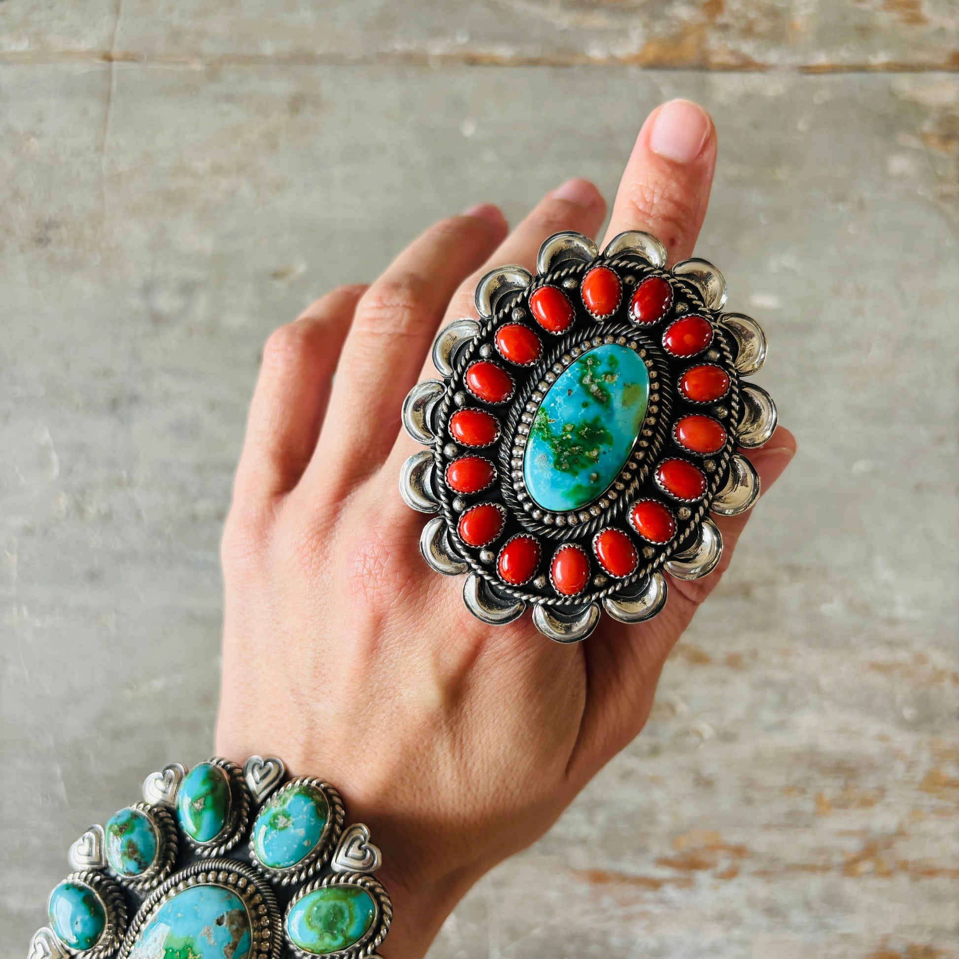 Navajo Hemerson Brown Sterling Silver - Red Coral & Sonoran Turquoise Cluster Statement Ring