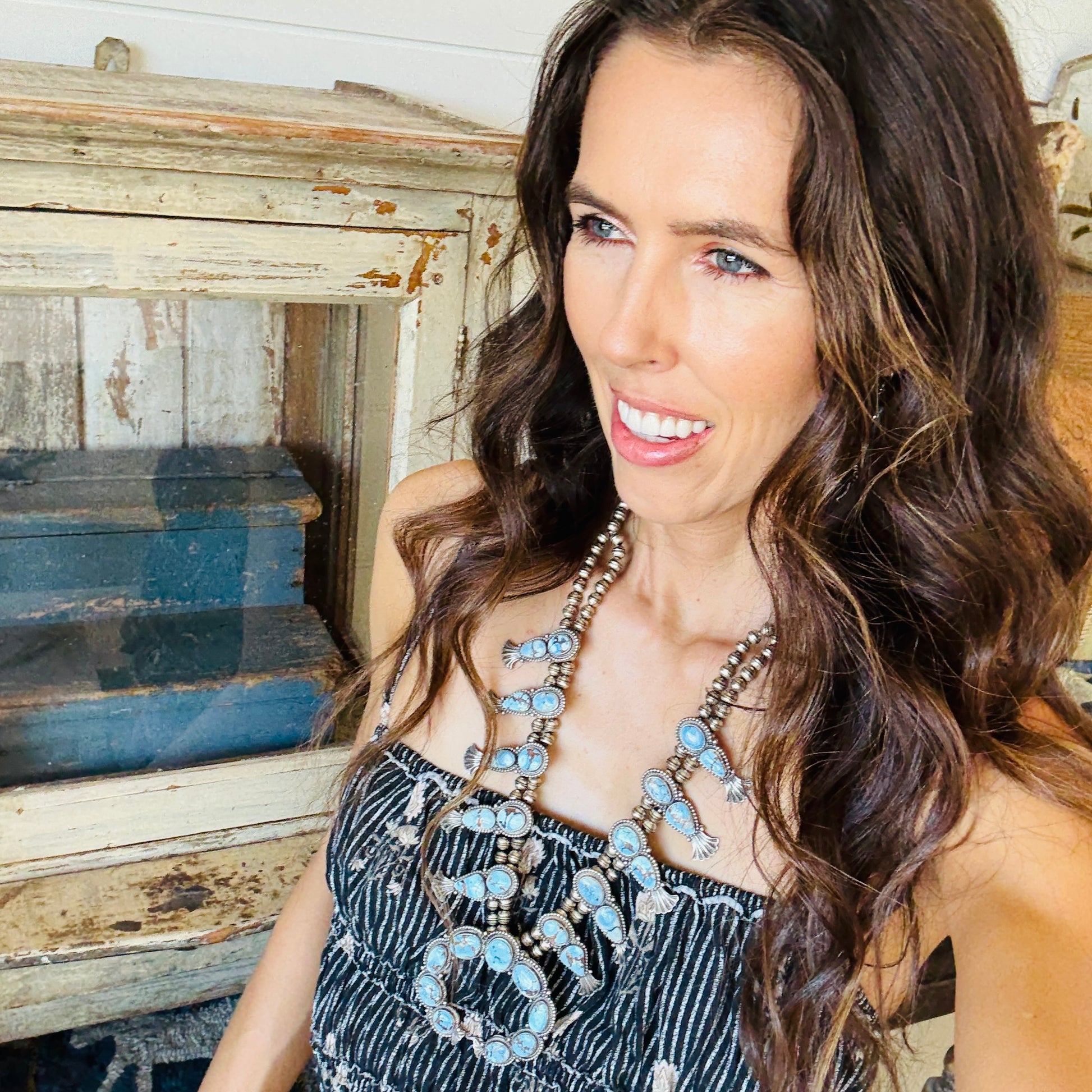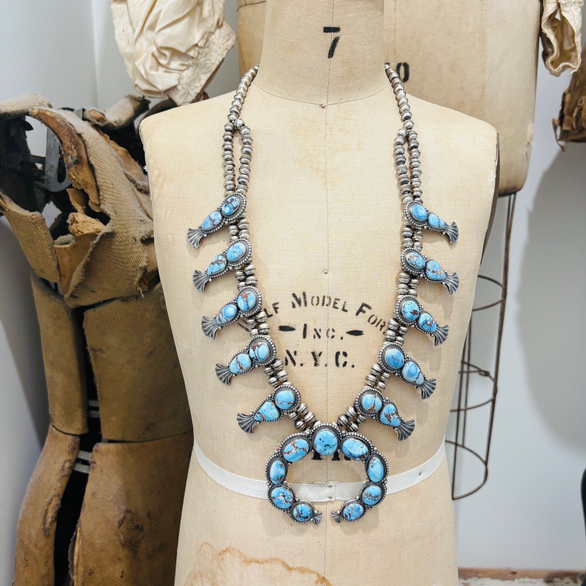 Navajo Justine Tso Sterling Silver & Golden Hills Turquoise Squash Blossom Necklace Set