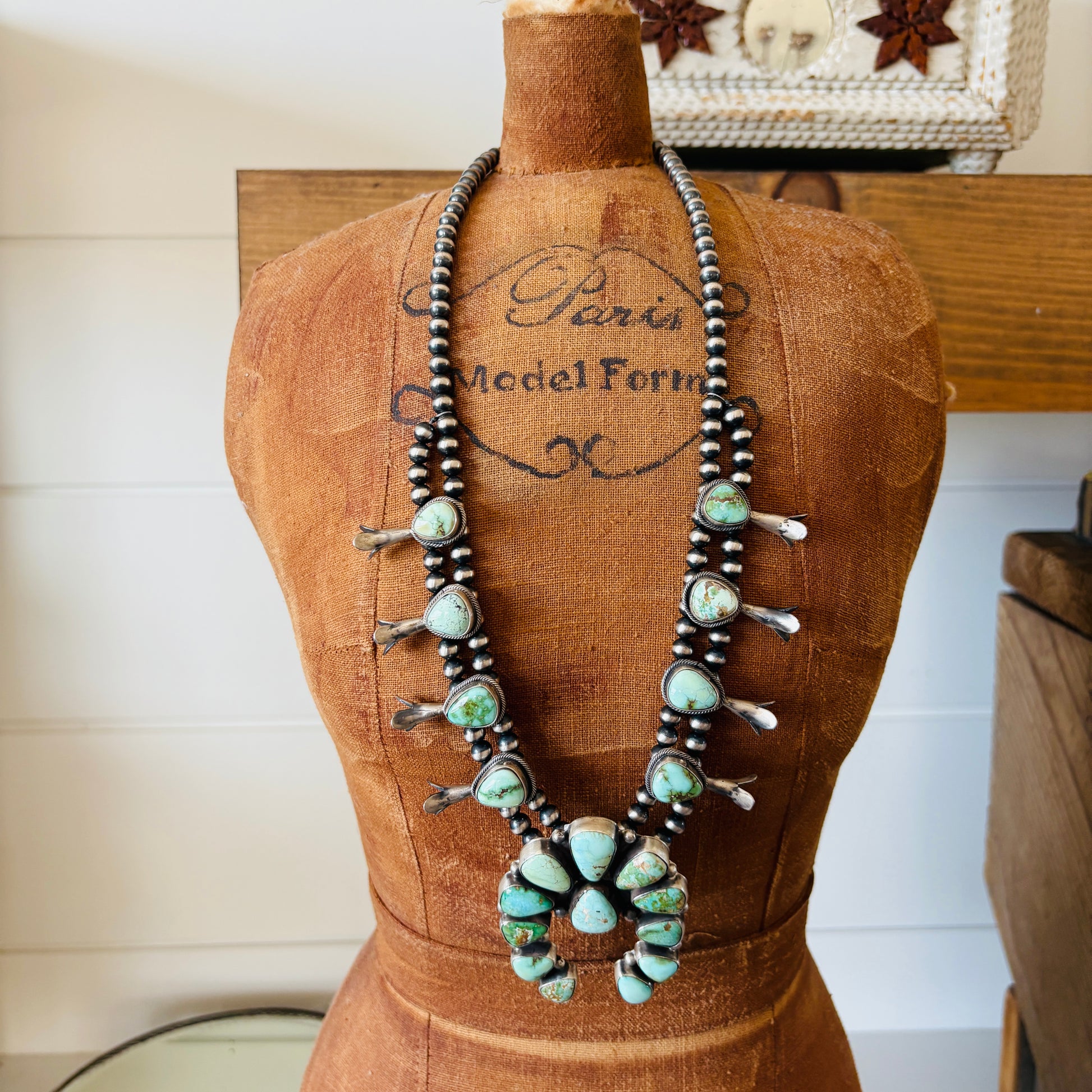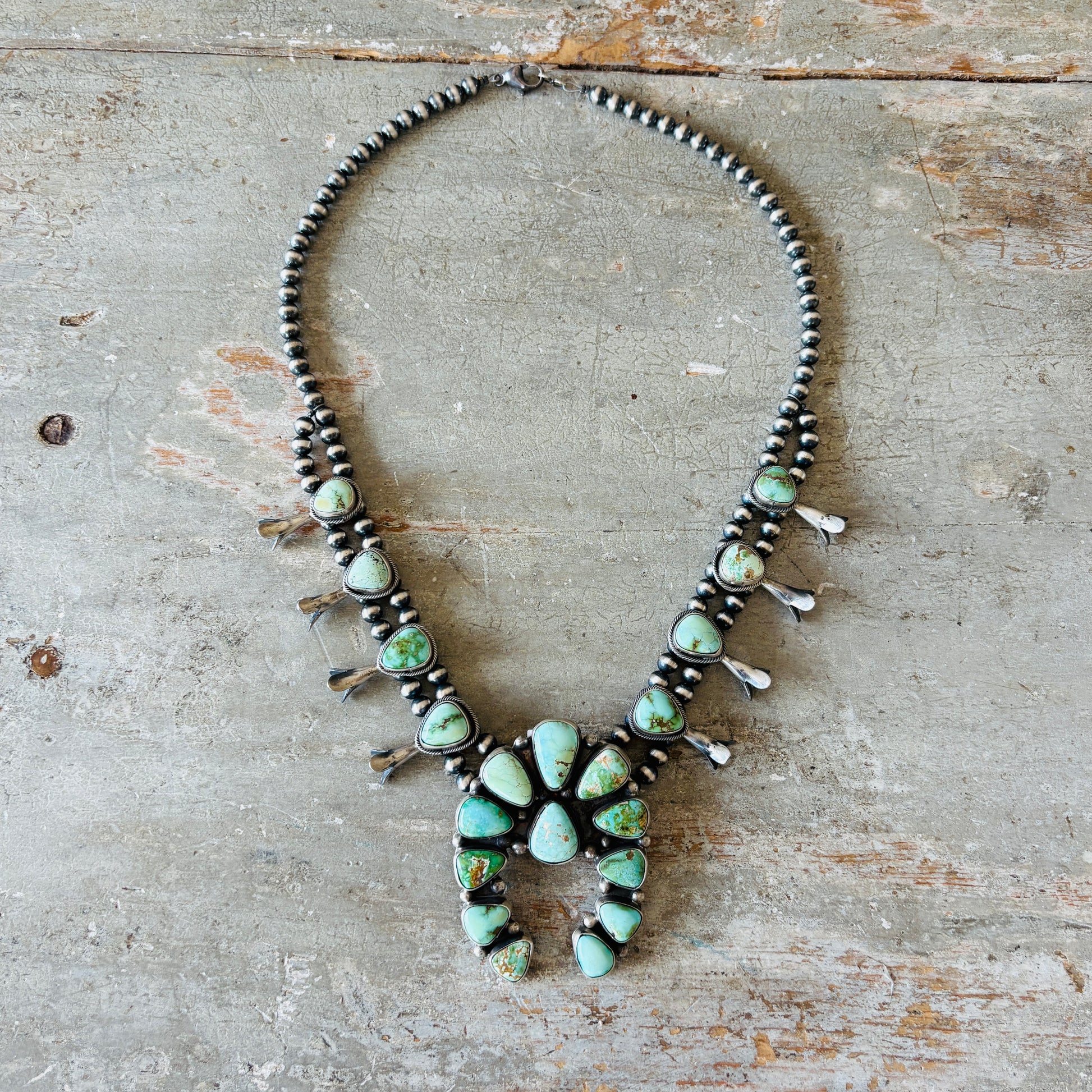 Navajo Rena Shelly Sterling Silver - Carico Lake & Sonoran Turquoise Squash Blossom Necklace