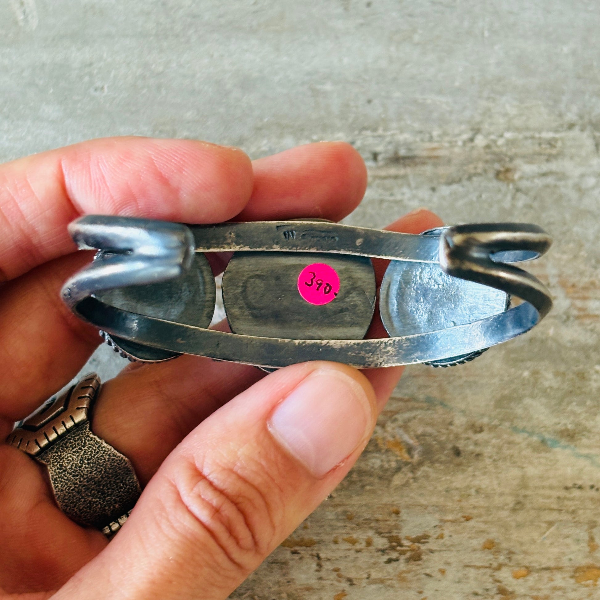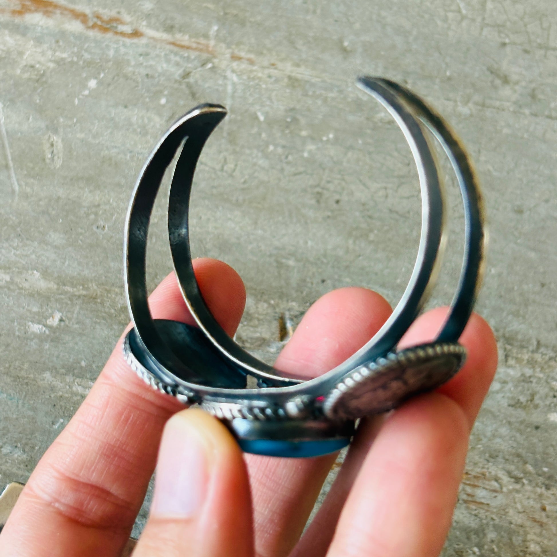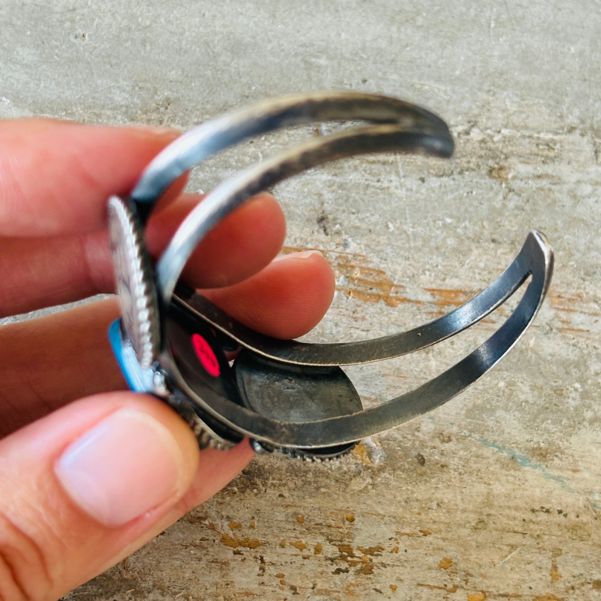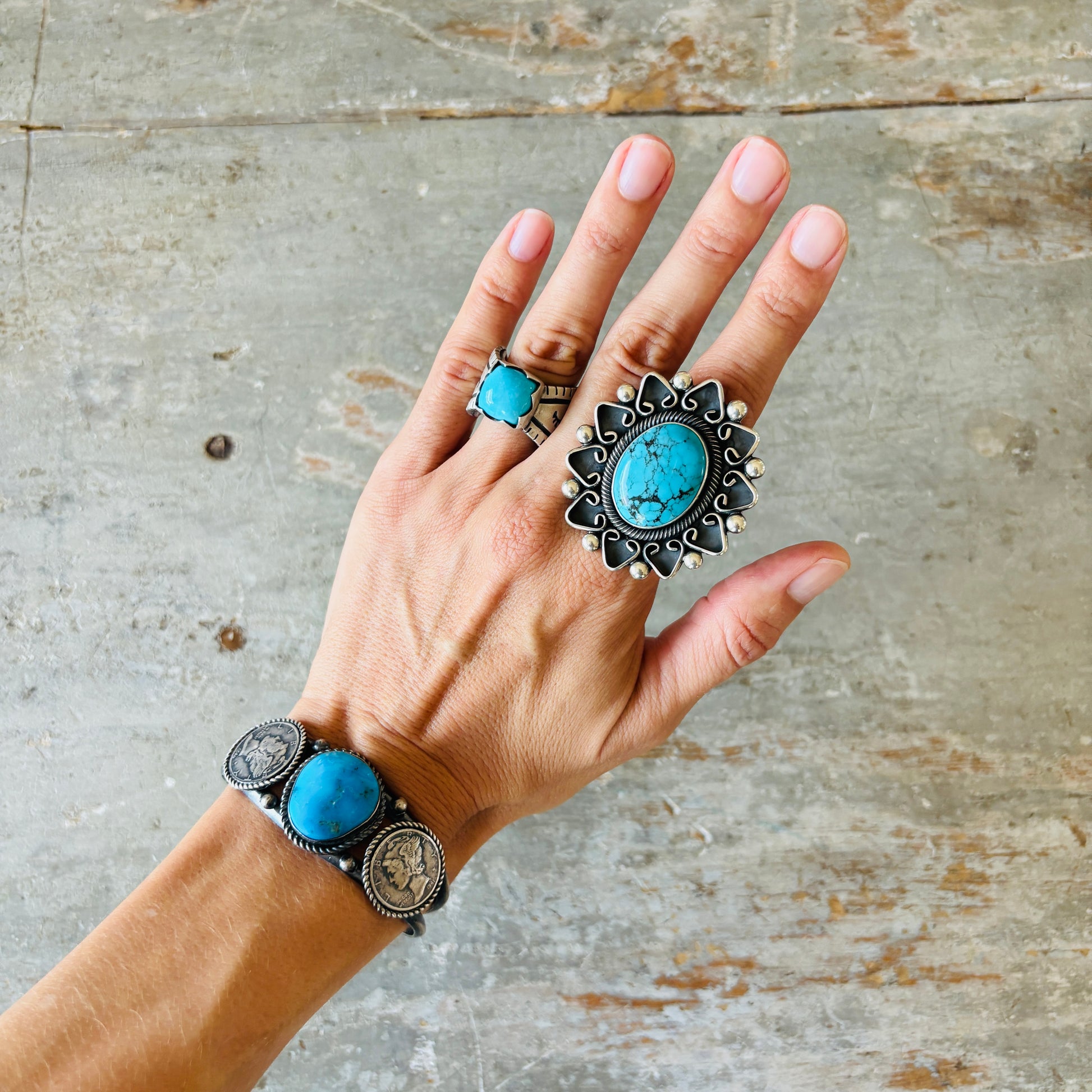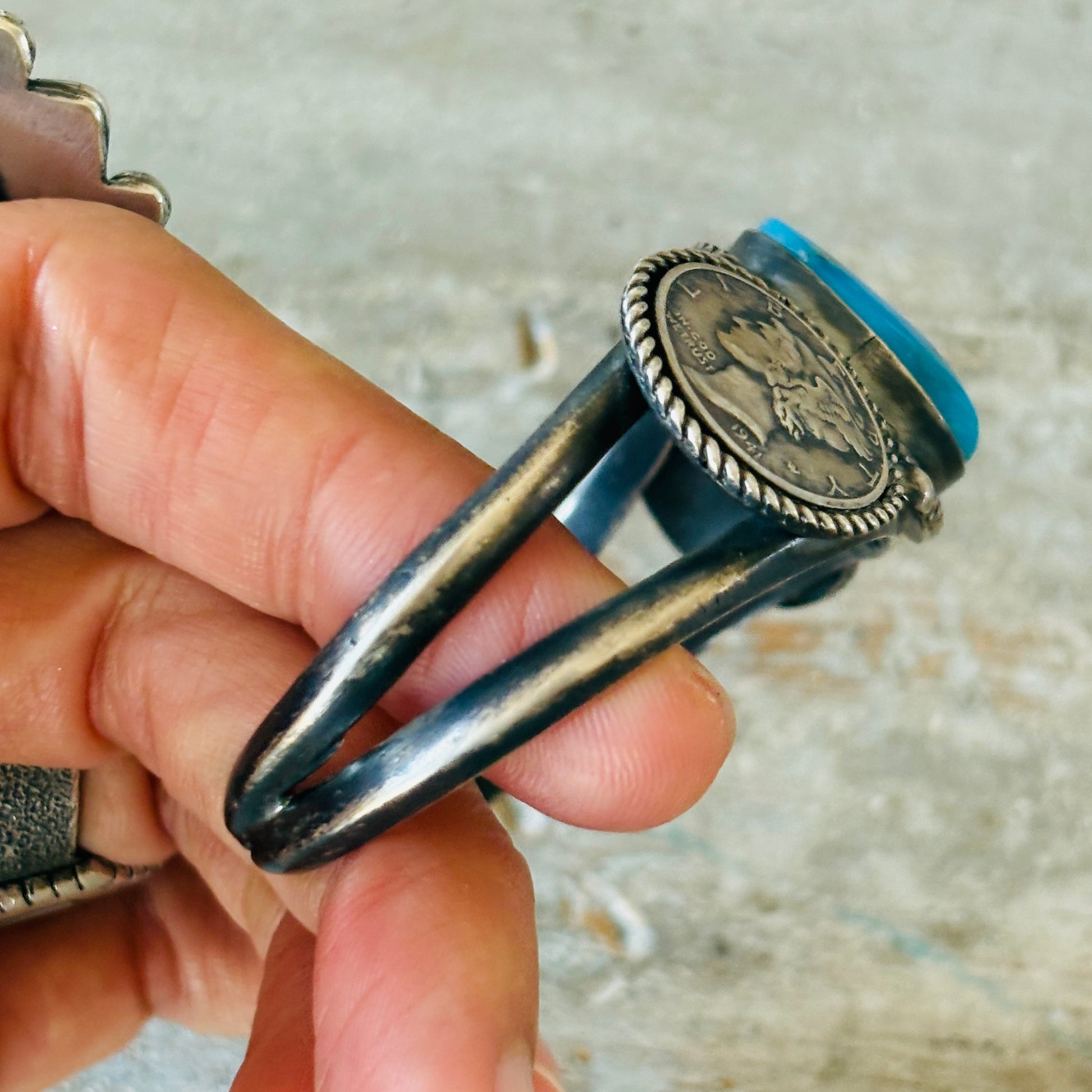 Navajo Signed Sterling Silver & Kingman Turquoise Liberty Coin Cuff