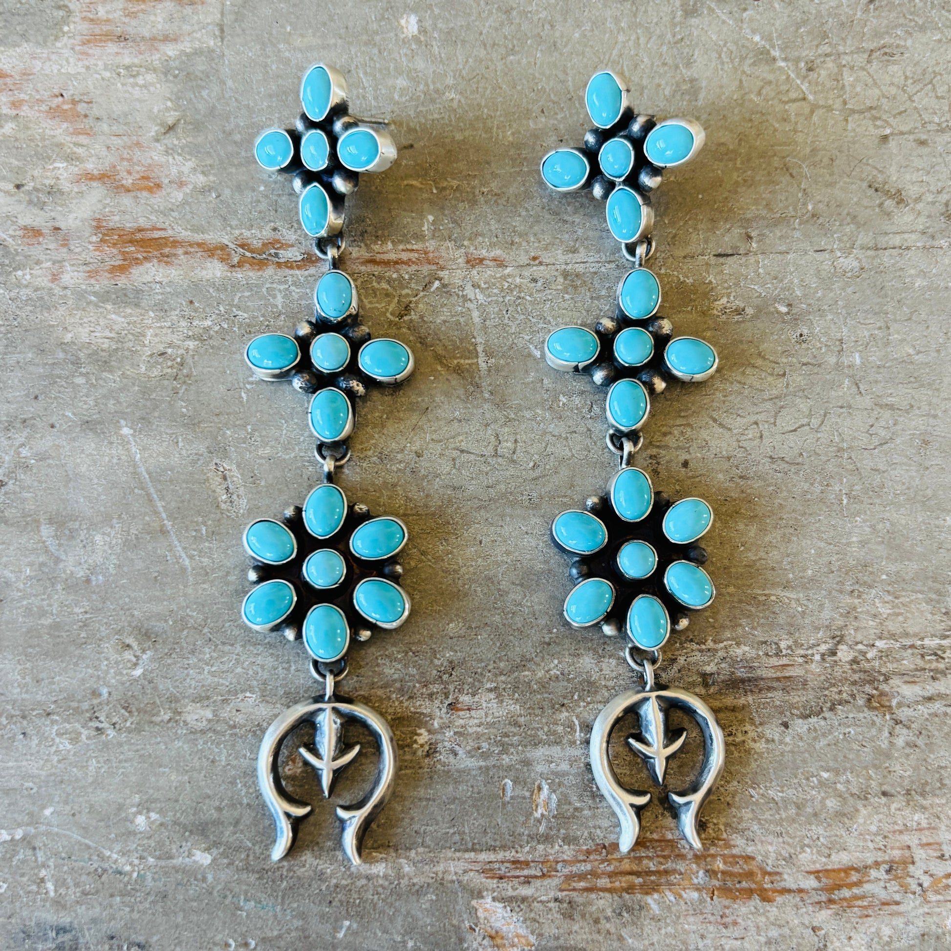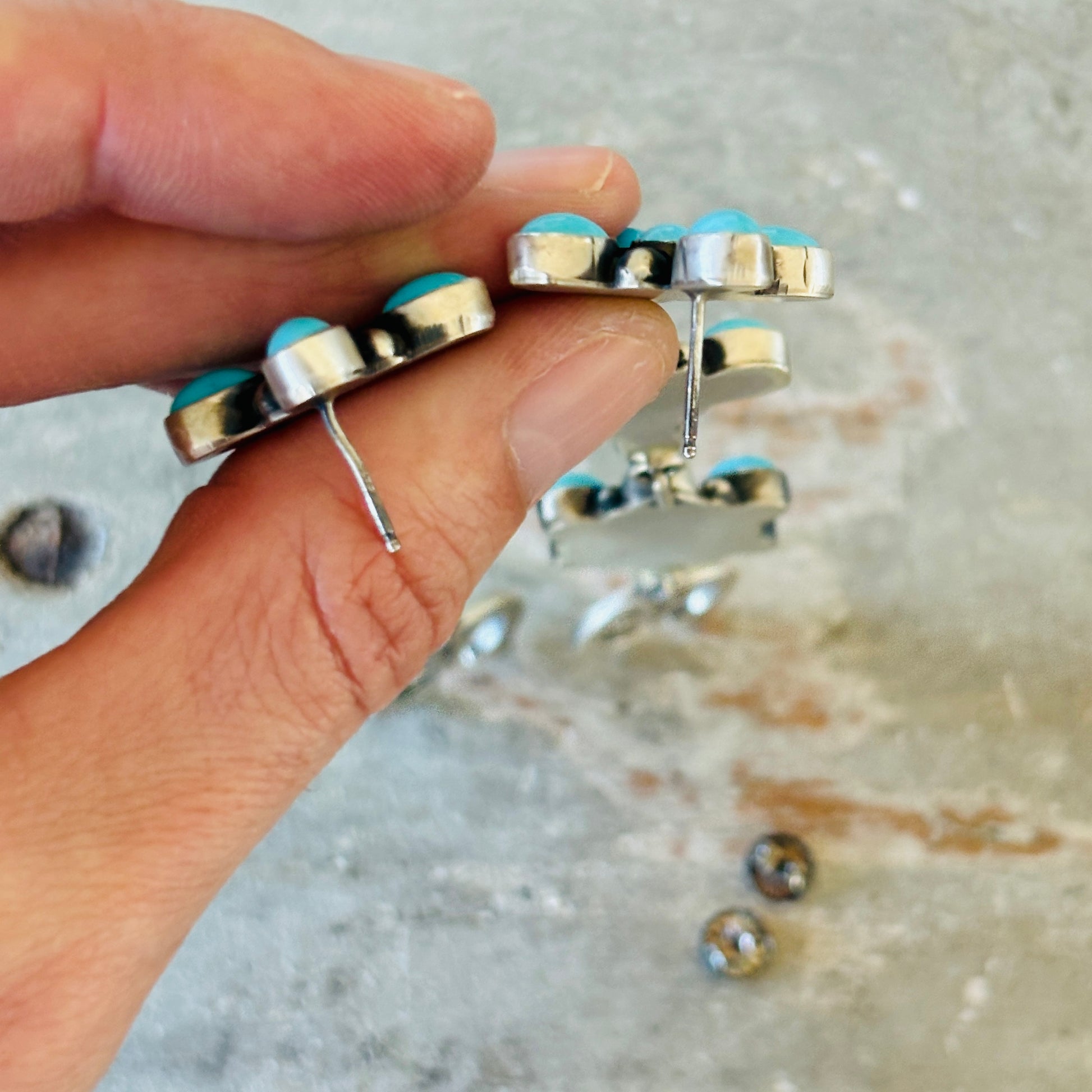 Navajo Travis Jim Sterling Silver & Kingman Turquoise Cluster Naja Earrings
