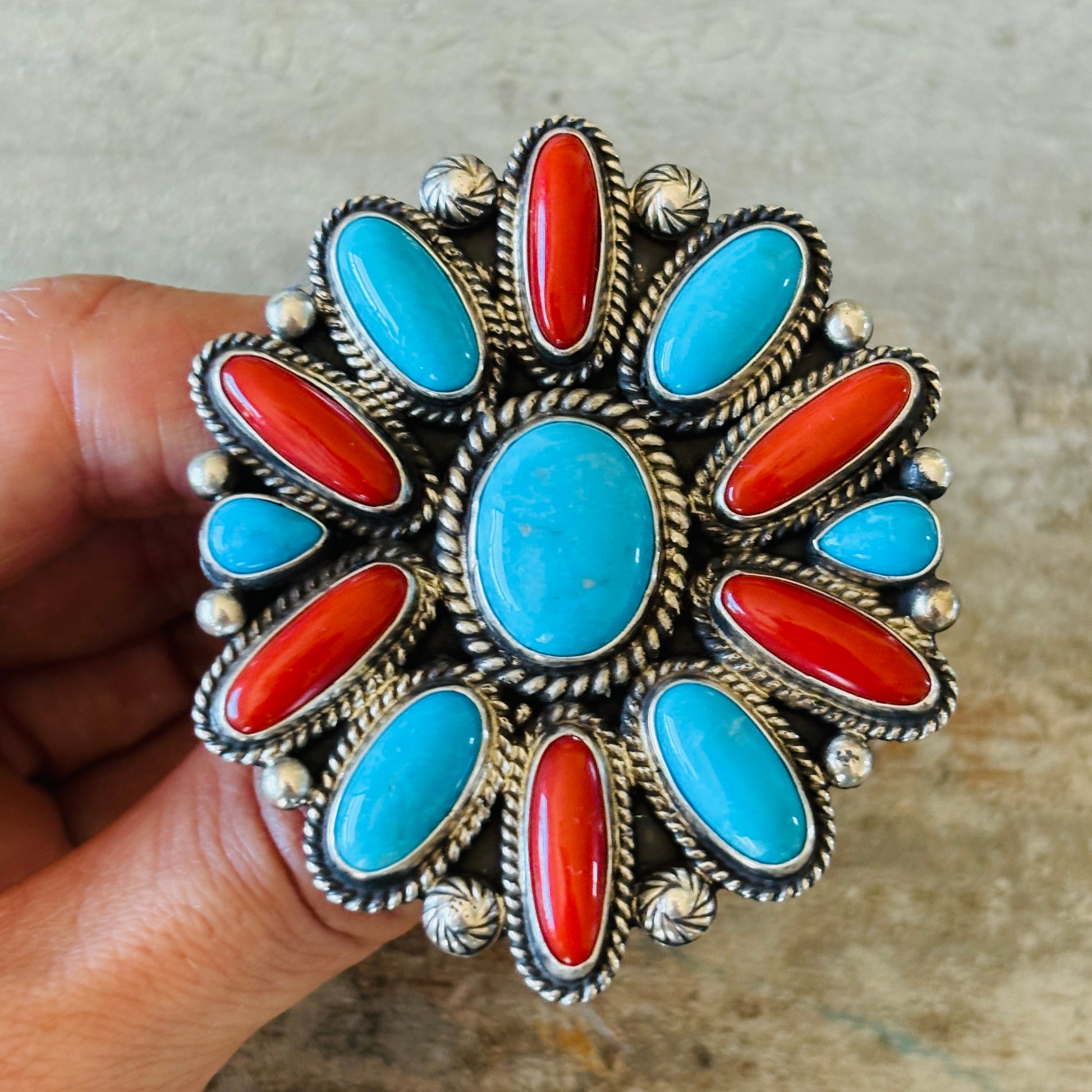 Navajo Tyler Brown Sterling Silver - Red Coral & Kingman Cluster Statement Ring