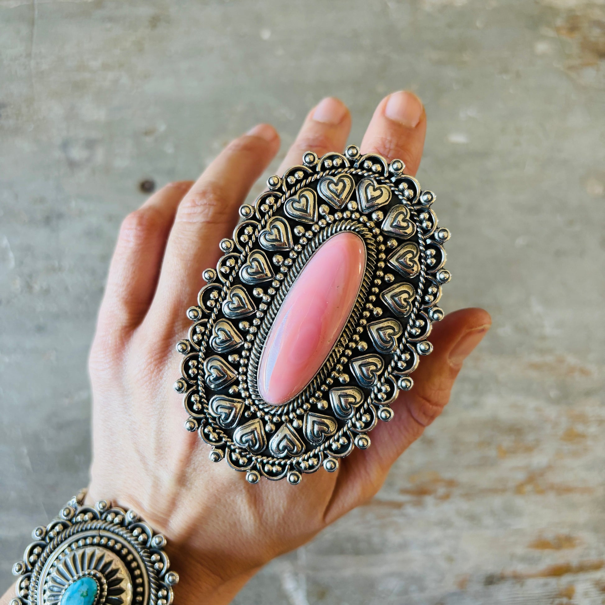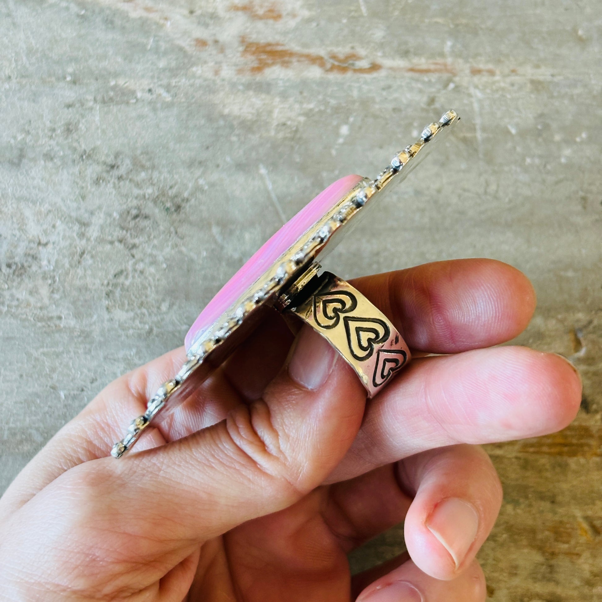 New Navajo Hemerson Brown Sterling Silver & Pink Conch Hearts Ring